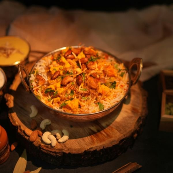 A rich, slow-cooked stew of tender goat meat, wheat, and lentils, simmered with aromatic spices until silky and melt-in-your-mouth. Finished with ghee, fried onions, herbs, lemon, and ginger for deep, comforting flavor.